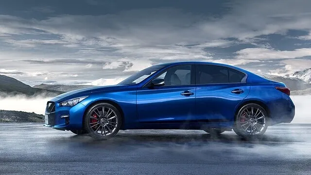澄んだ空の下、鮮やかなブルーのセダンが静かに佇むこの一枚。