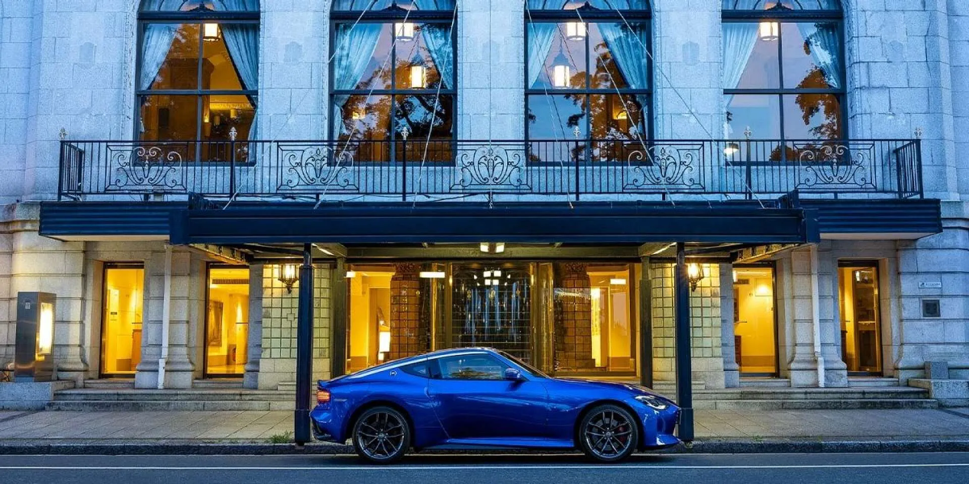 夕暮れ時、青いスポーツカーが静かにホテルのエントランス前に停まっています。