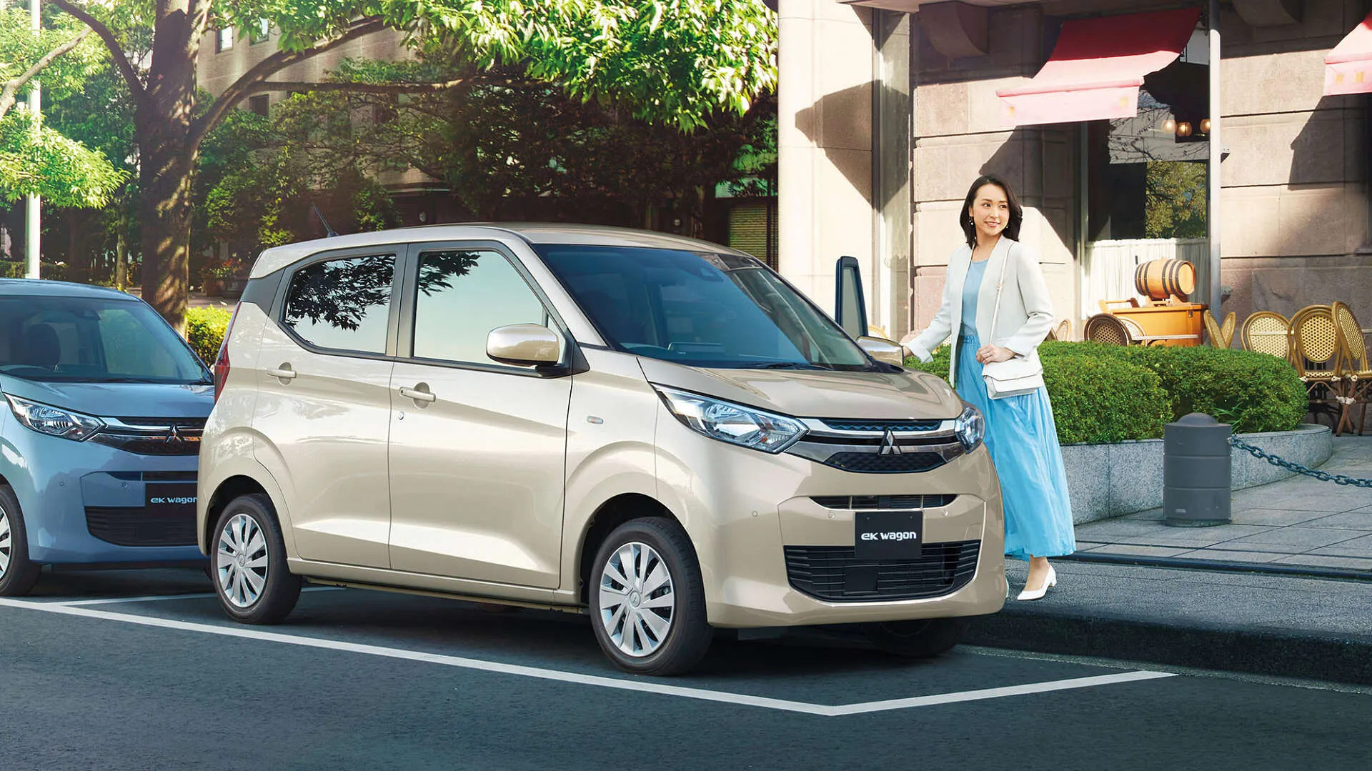 明るい日差しの中、カフェの前でふと足を止めた女性が、やさしい色合いの三菱ekワゴンに手をかけています。