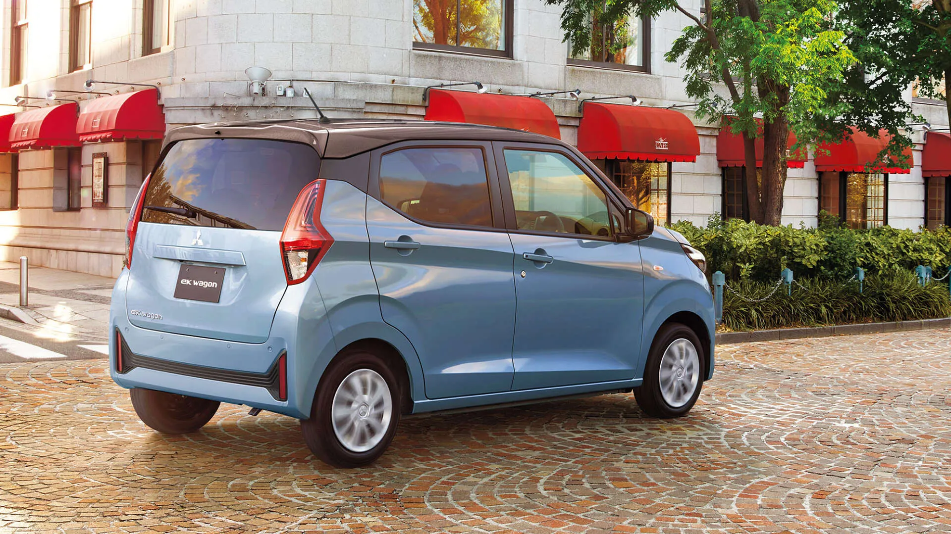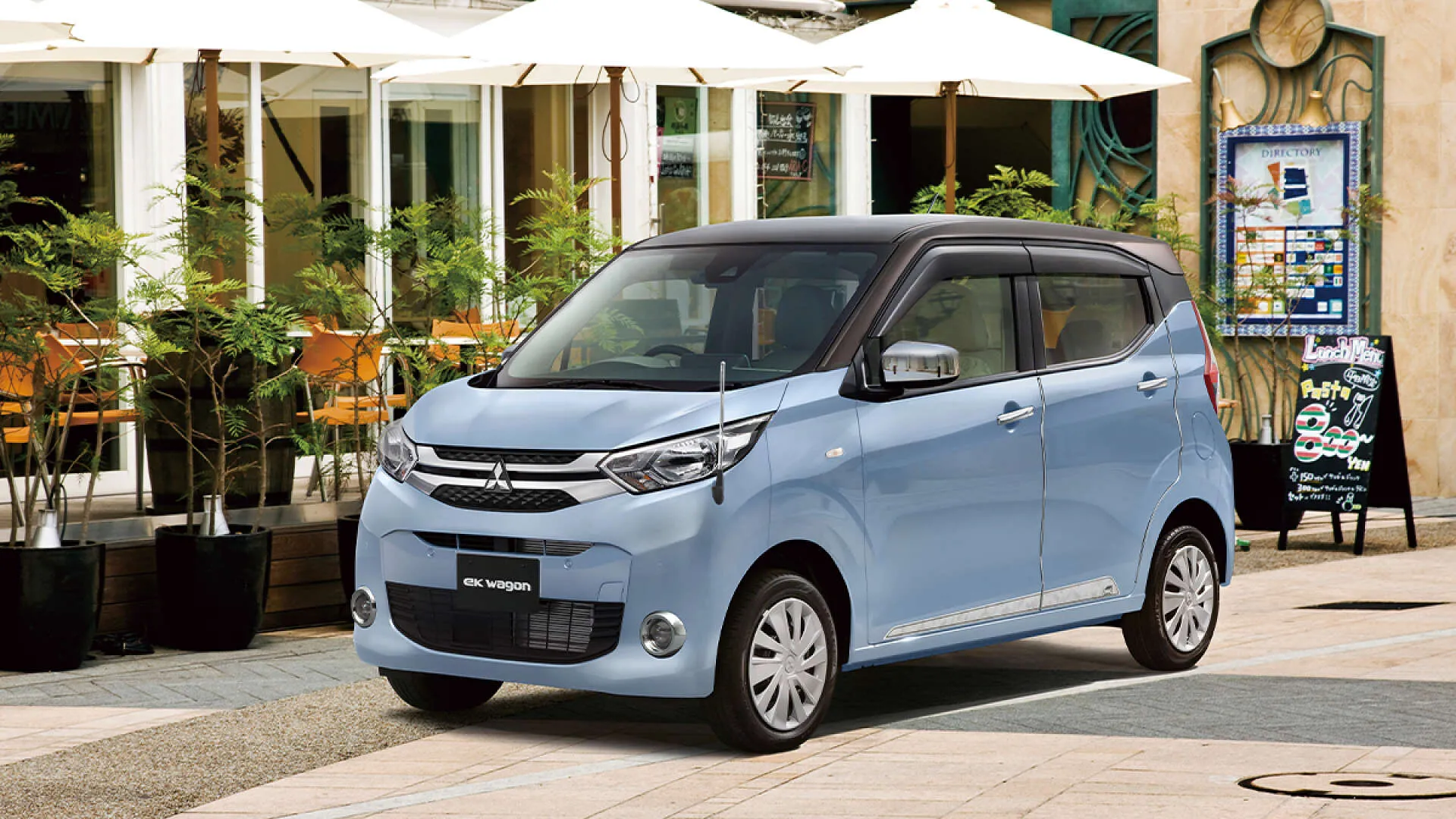 カフェのテラス席が並ぶ街角に、三菱ekワゴンが静かに停まっています。