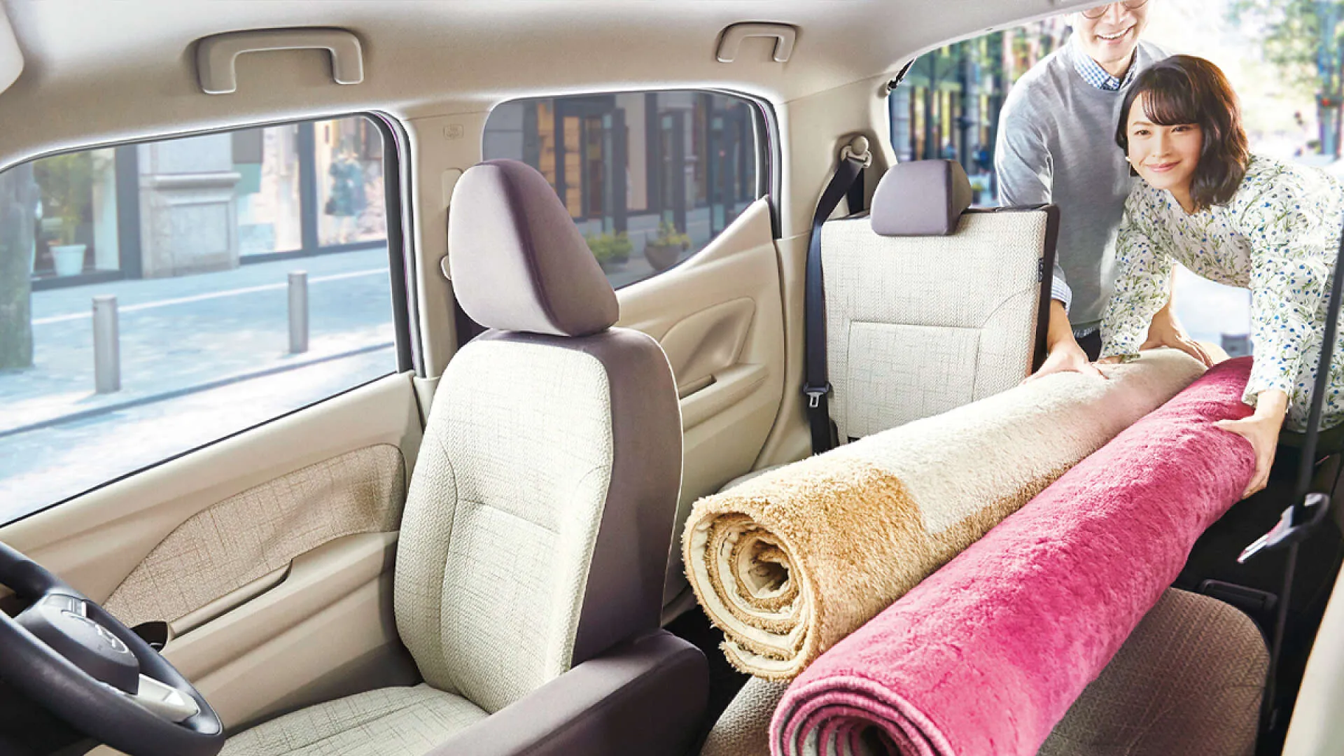お二人でラグマットを車に積み込む、そんな日常のワンシーンが