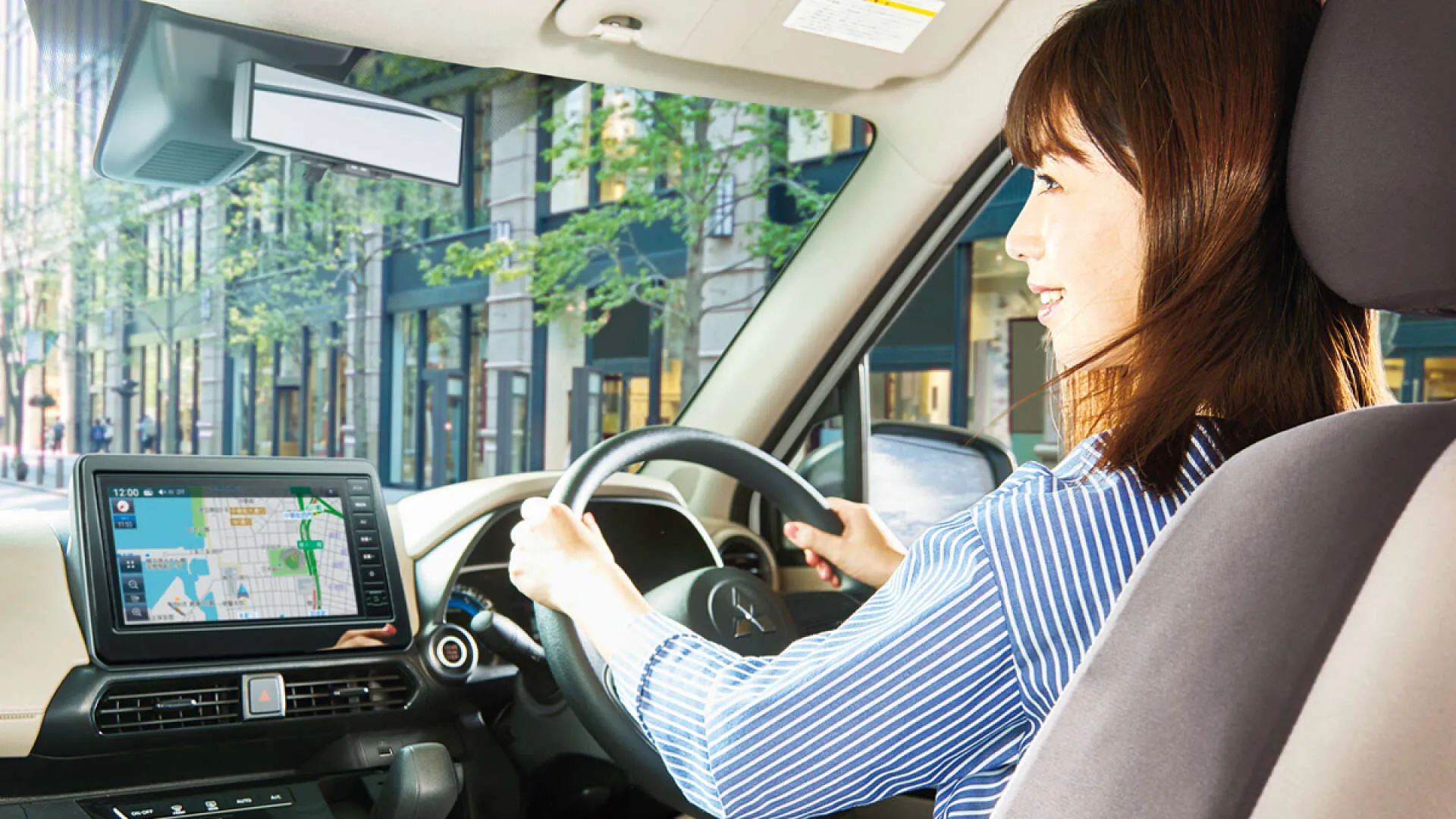 朝の光が差し込む車内で、ナビゲーション画面を頼りに新しい道へと進んでいくひと時。