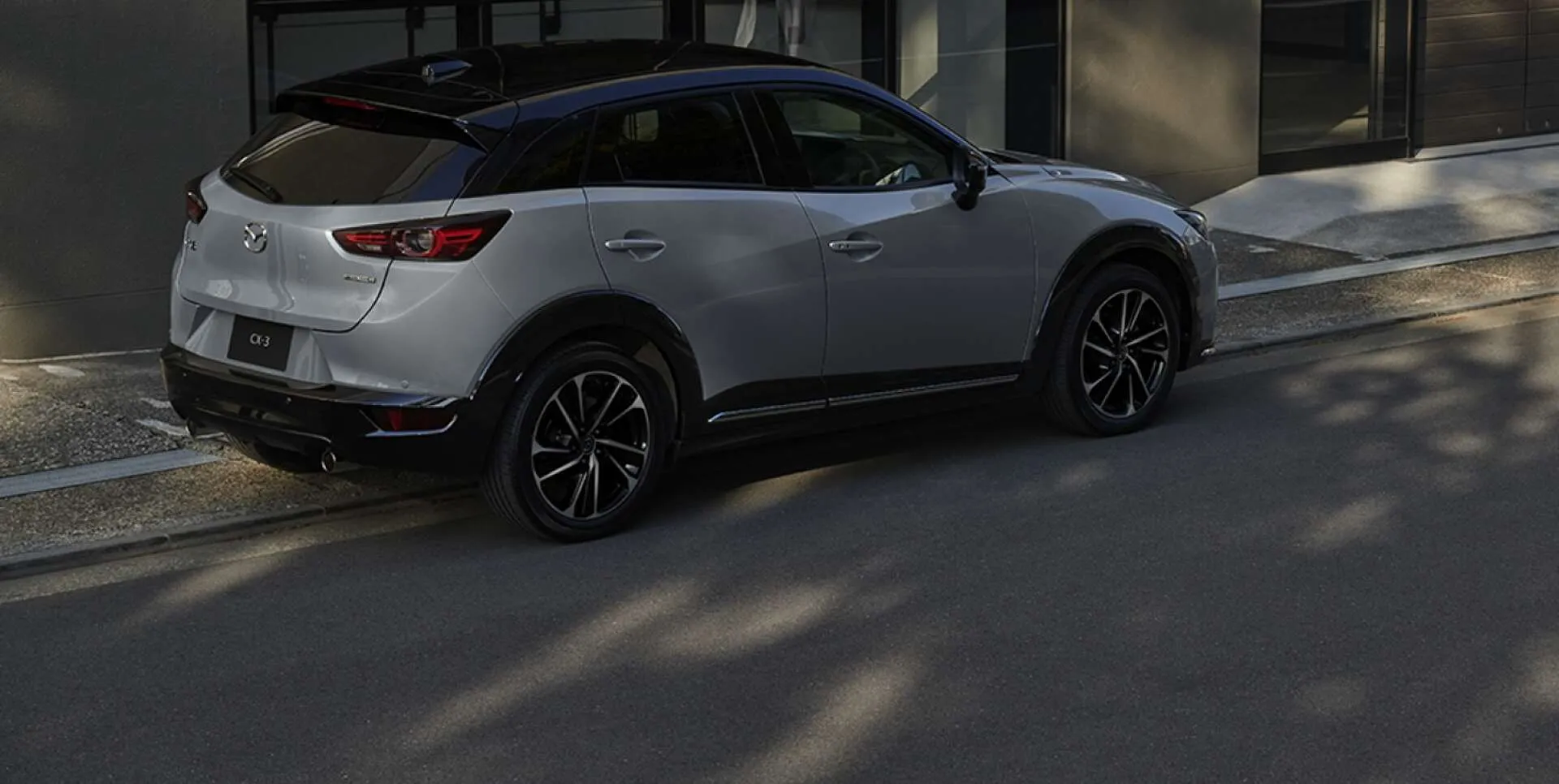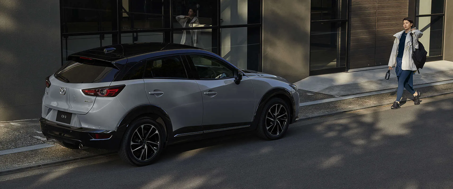 ガラス張りの建物沿いに、CX-3が静かに佇んでいます。朝の光を浴びて、街中でも自然と馴染むその姿は、普段使いにもぴったりです。