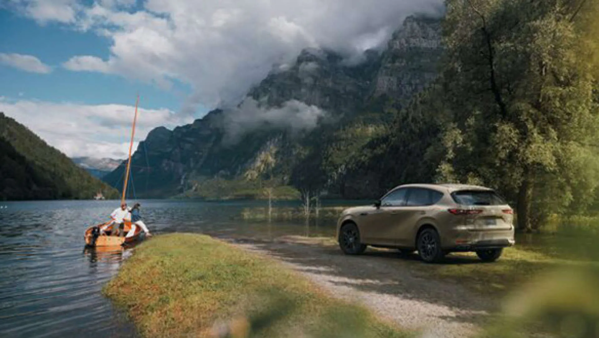 湖畔に停めたSUVのそばで、ボートを楽しむ家族の姿が印象的です。