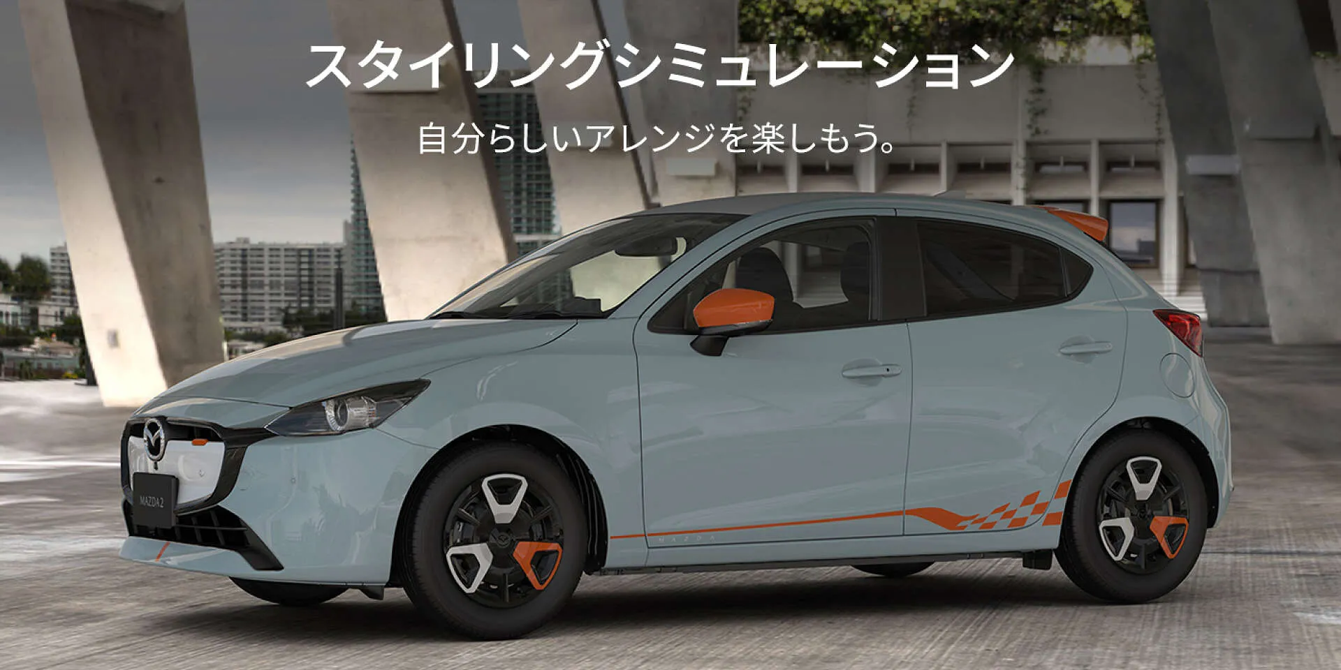 MAZDA2のボディに映えるオレンジのアクセントが、