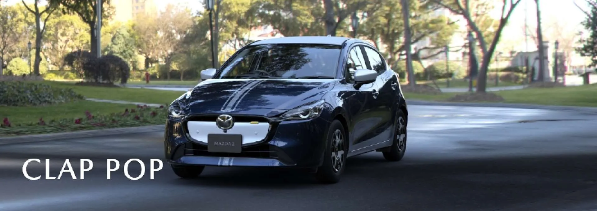 公園の緑に囲まれた道を、静かに走るMAZDA2。