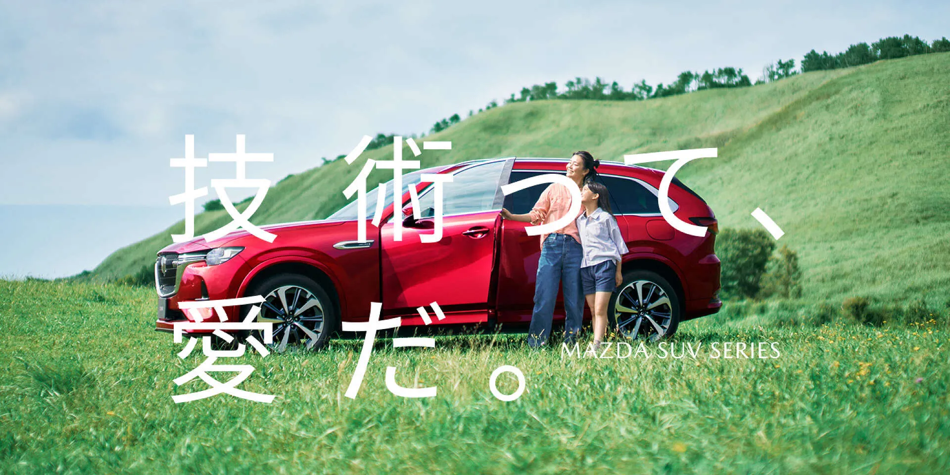 緑の丘に停めた赤い車と、親子で過ごす穏やかなひととき。