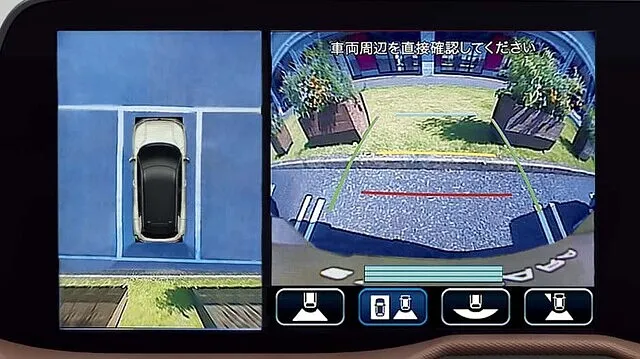 運転席に座ると、まず目に入るのがこのモニター画面。駐車場でのちょっとした緊張感も、こうして上からの視点や後方カメラでサポートされていると、