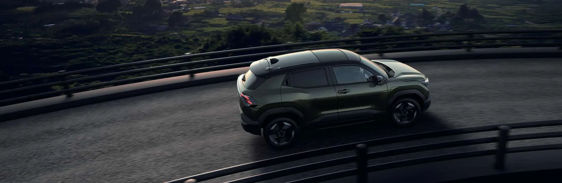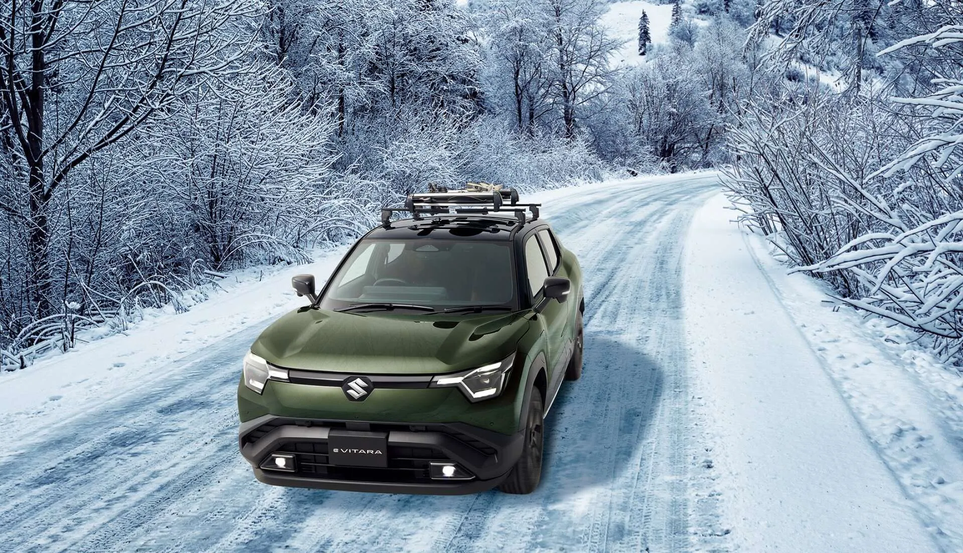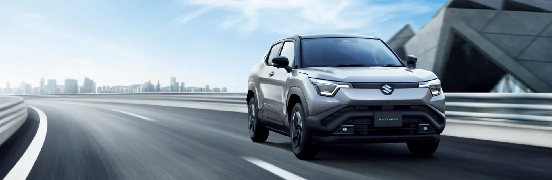 朝の光が差し込む高速道路を、スズキeビターラが静かに走り抜けていく様子が印象的です。