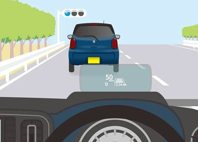 前方には同じくリース契約で利用されているかもしれない青い軽自動車が見え、ヘッドアップディスプレイには速度や安全支援機能など必要な情報がしっかり表示されています。