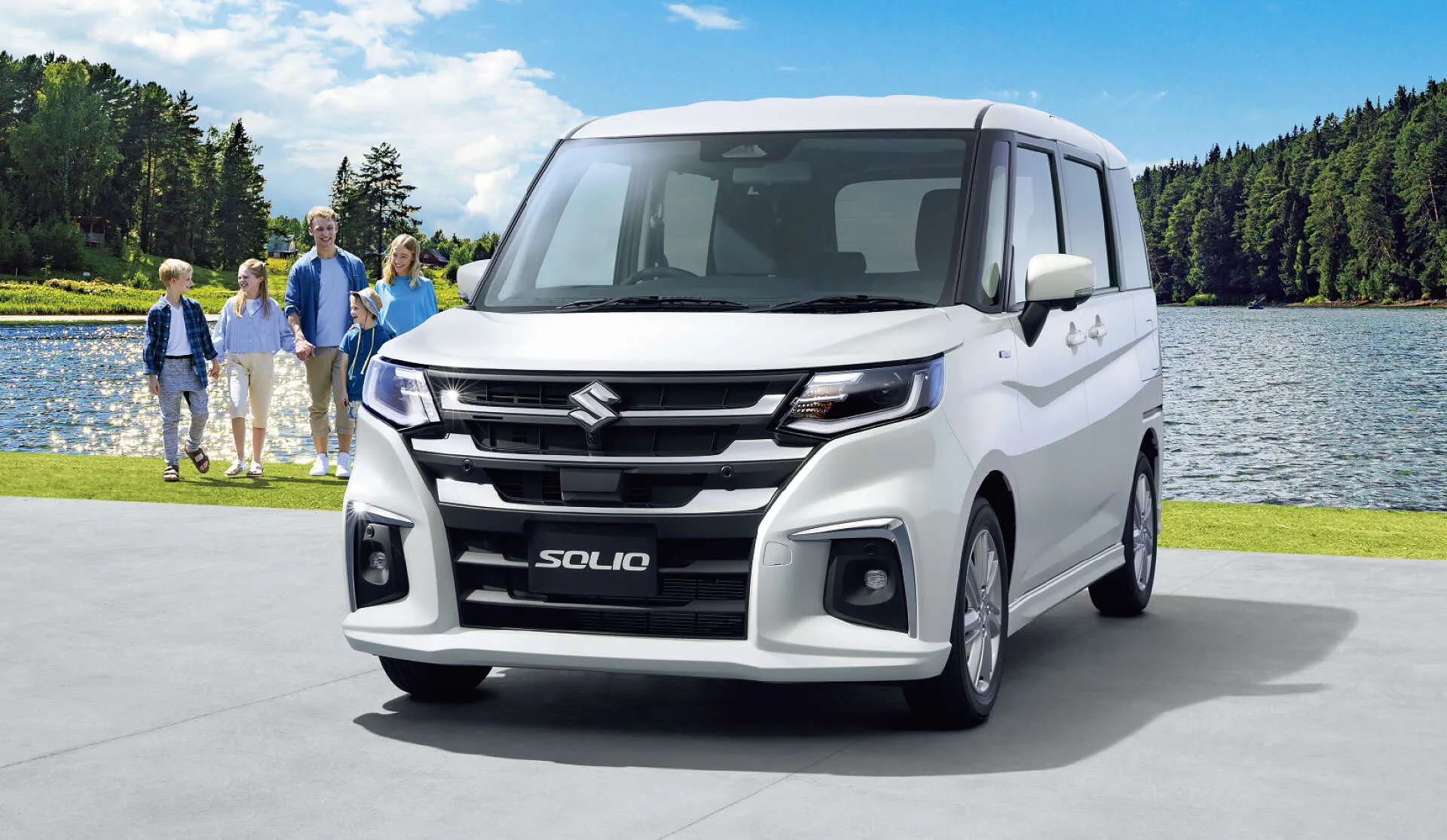 青空の下、湖畔で楽しそうに過ごすご家族と、そのそばに停まるスズキ ソリオ。