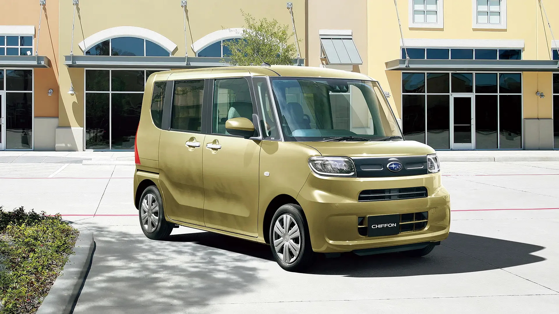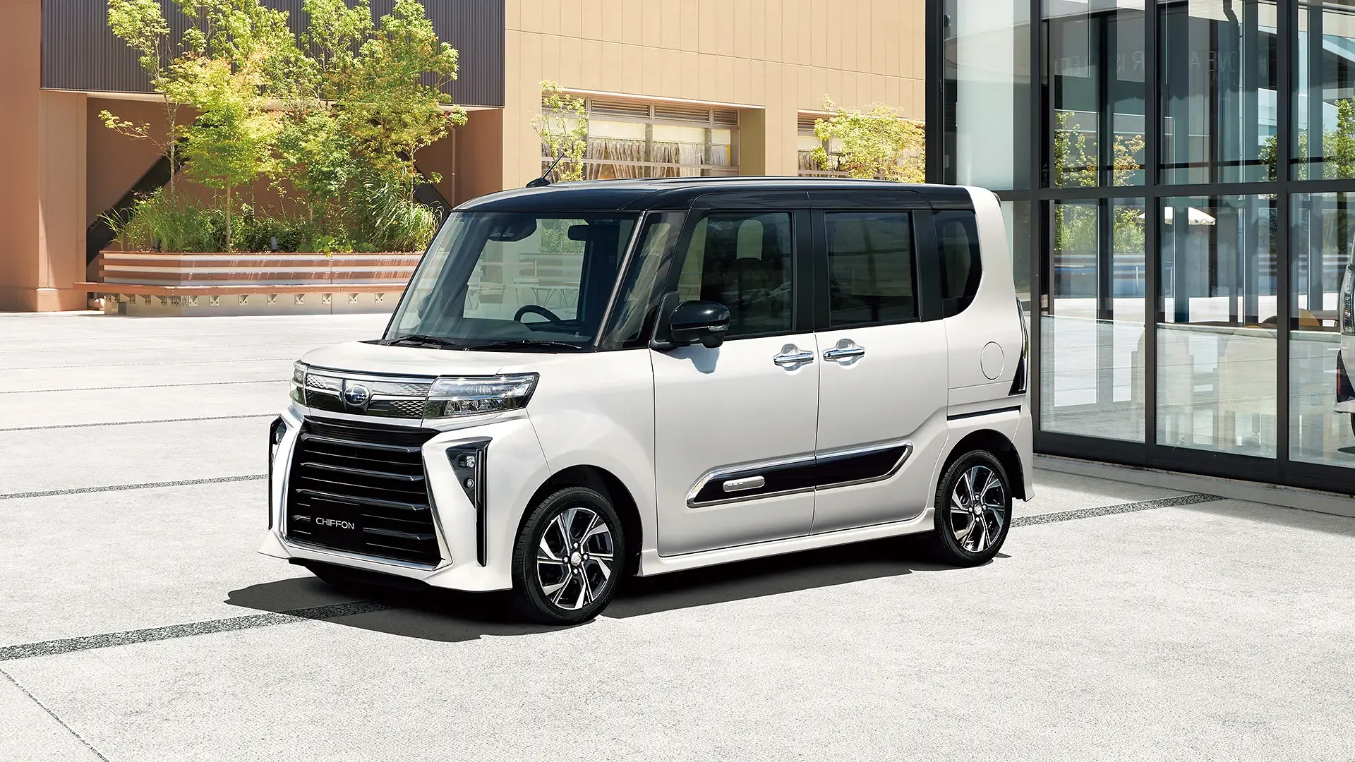 ガラス張りの建物前に停まるシフォンが、街中の日常に自然と溶け込んでいます。