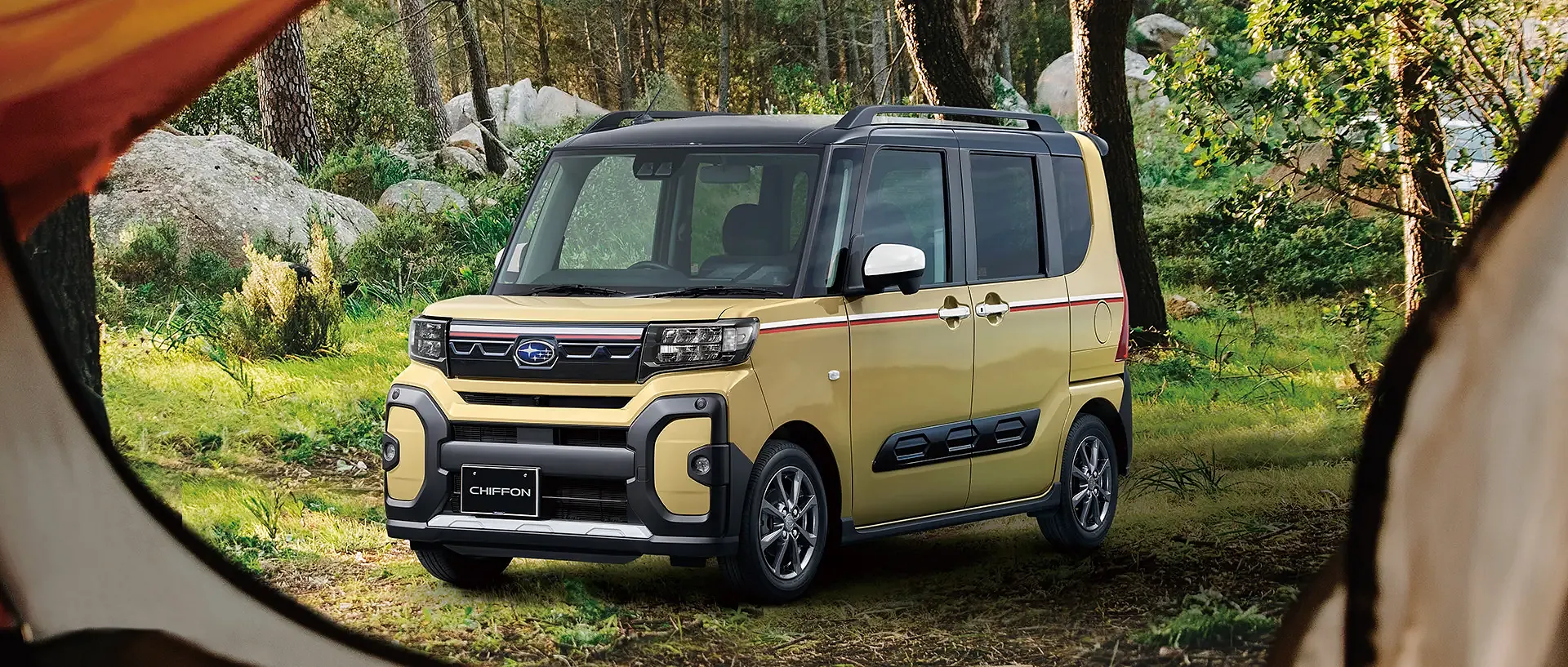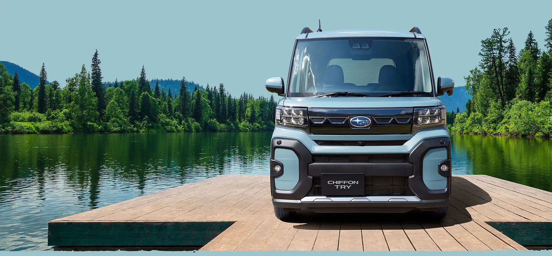 湖畔のウッドデッキに停まるシフォン トライが、休日のひとコマを彩ります。