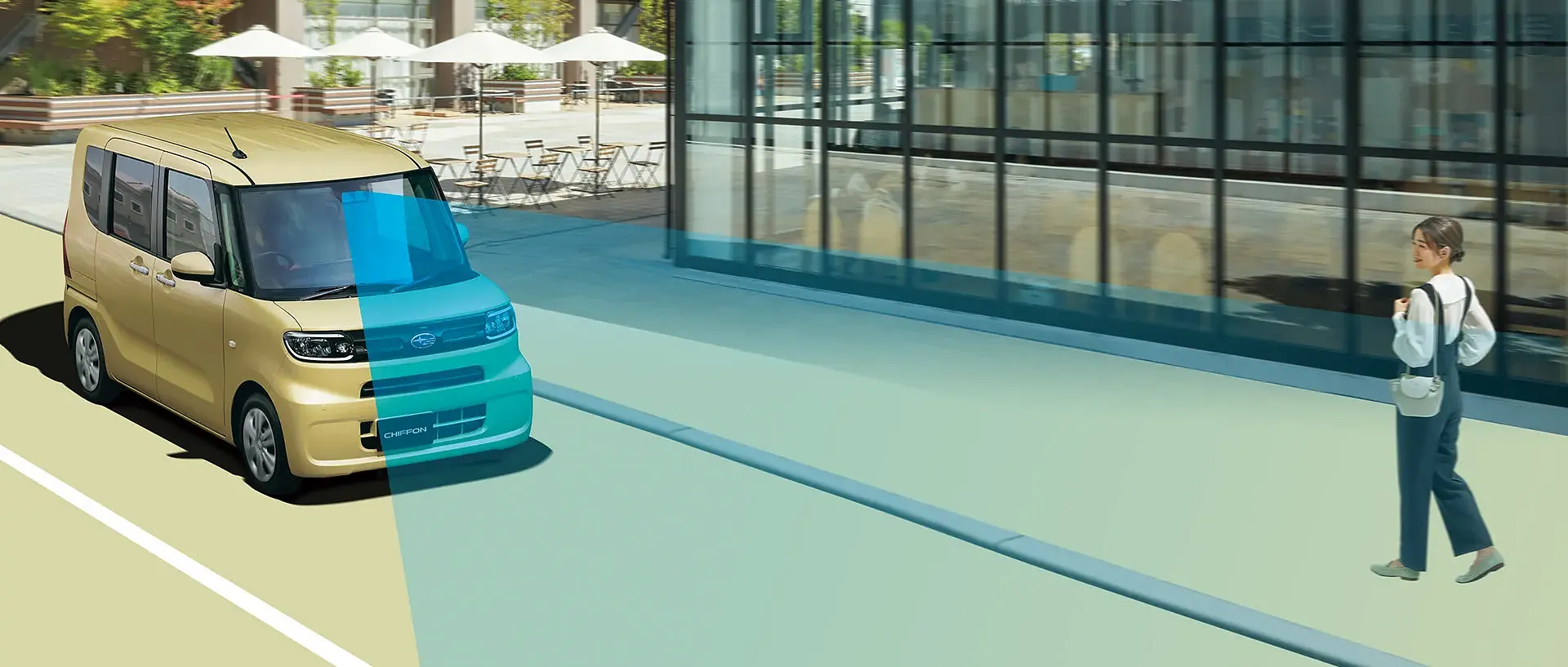 カフェのテラス席が並ぶ静かな通りで、シフォンがゆっくりと進んでいきます。ガラス張りのおしゃれな建物の前を歩く女性も、どこか安心した表情です。