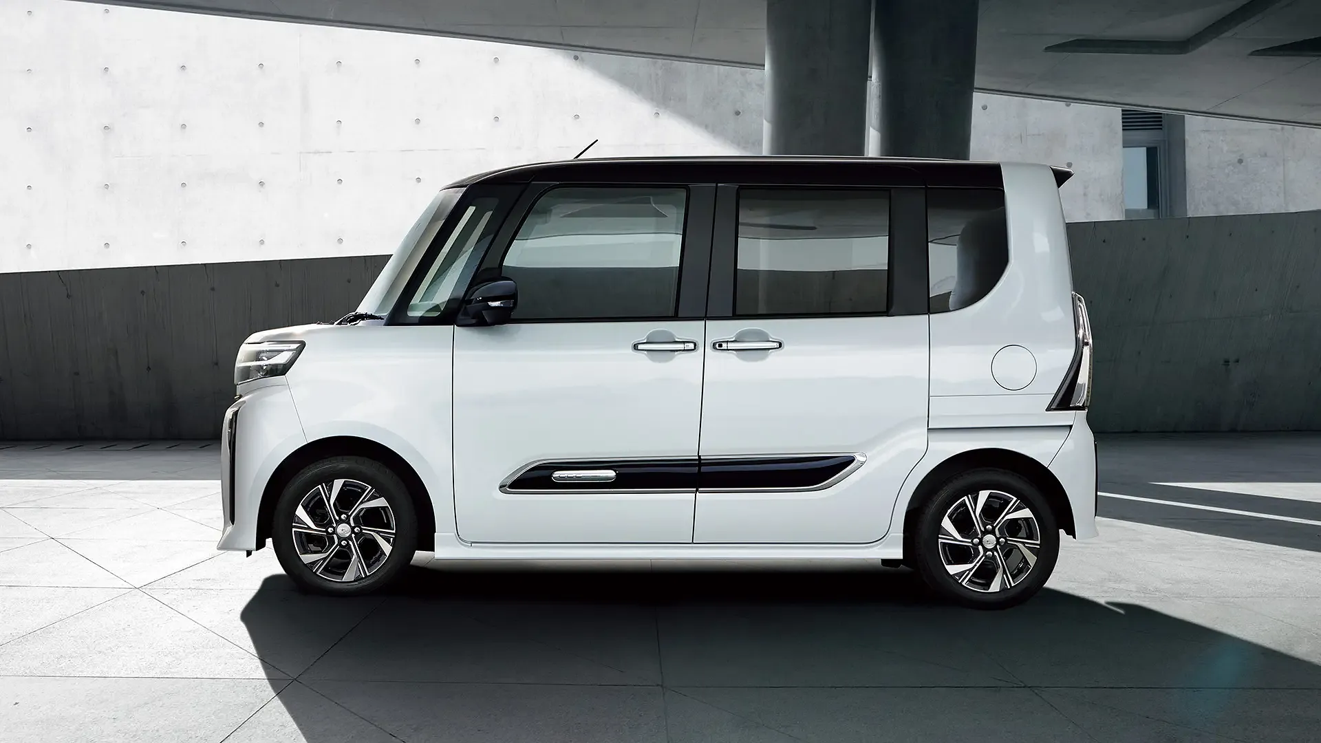 コンクリートの建物を背景に、スタイリッシュな白い軽自動車が静かに佇んでいます。日常の移動や買い物、家族とのお出かけなど、富士市の街並みにも自然と溶け込むデザインです。